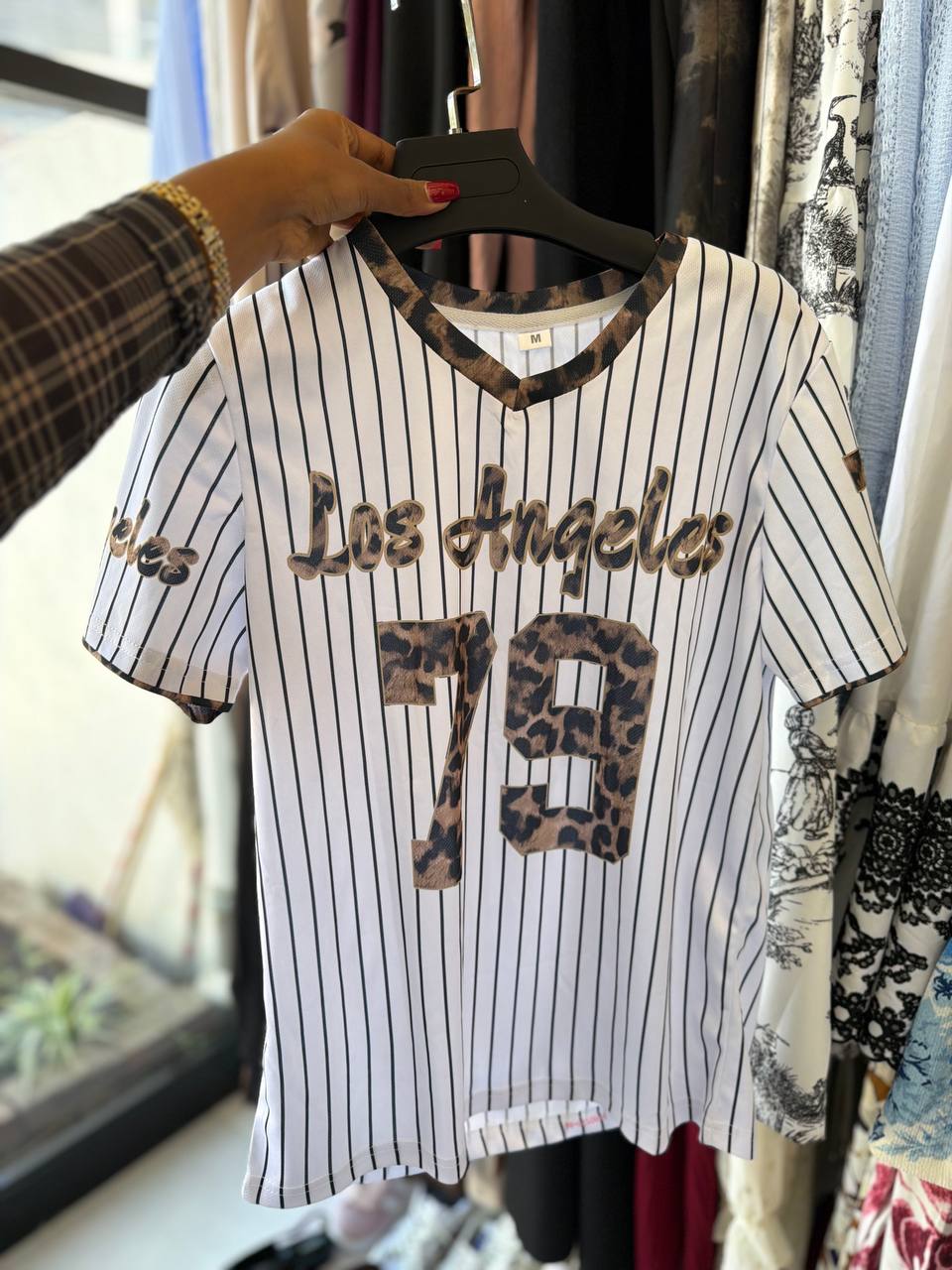 Redefine your urban wardrobe with this unique crossover jersey that pushes the boundaries of traditional fan gear. Featuring a breathable, relaxed fit and a crisp pinstriped body, this top is elevated by striking leopard-print trim along the V-neck collar and sleeves, along with matching patterned numerals for a touch of fierce personality. The “Los Angeles” script adds a nostalgic, coastal vibe, while the dropped shoulders and mesh-inspired texture ensure maximum comfort and airflow. Perfect for layering over a pleated skirt or pairing with distressed denim, this piece is designed for those who want to stand out at the intersection of sport and style.